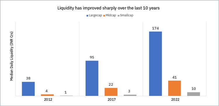 The Median Daily Liquidity shown in the chart above represents the value of all shares of a company that were traded on a typical day. The daily liquidity of a typical Largecap stock has grown nearly 5x from ₹38 Crs in 2012 to ₹174 Crs in 2022. Similarly, the daily liquidity of a typical Midcap as well as a Smallcap stock has grown nearly 10x over the last 10 years.