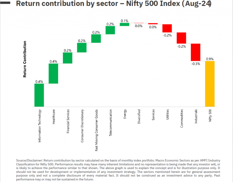• Healthcare & IT sector continued their upward journey and delivered returns of 5.5% & 4.7% respectively while Realty was the worst performing sector in August 2024.