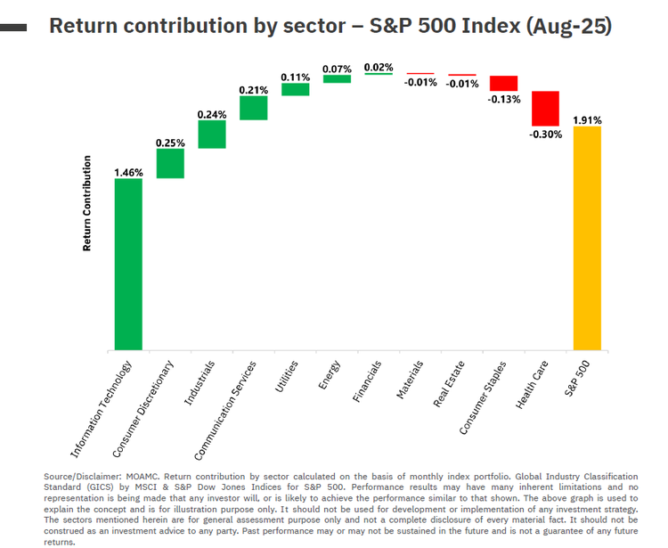 - S&P 500 advanced 1.91% in August, with IT driving most of the gains (+1.46%), whereas Healthcare pulled back the index by 0.30%.