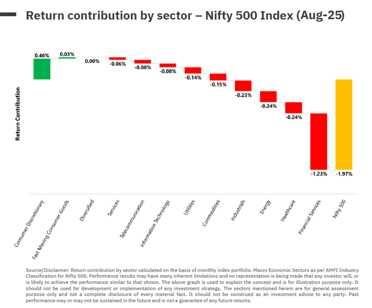 - Financial Services pulled the Nifty 500 Index down by -1.23%, while Healthcare and Energy each reduced it by -0.24%.
